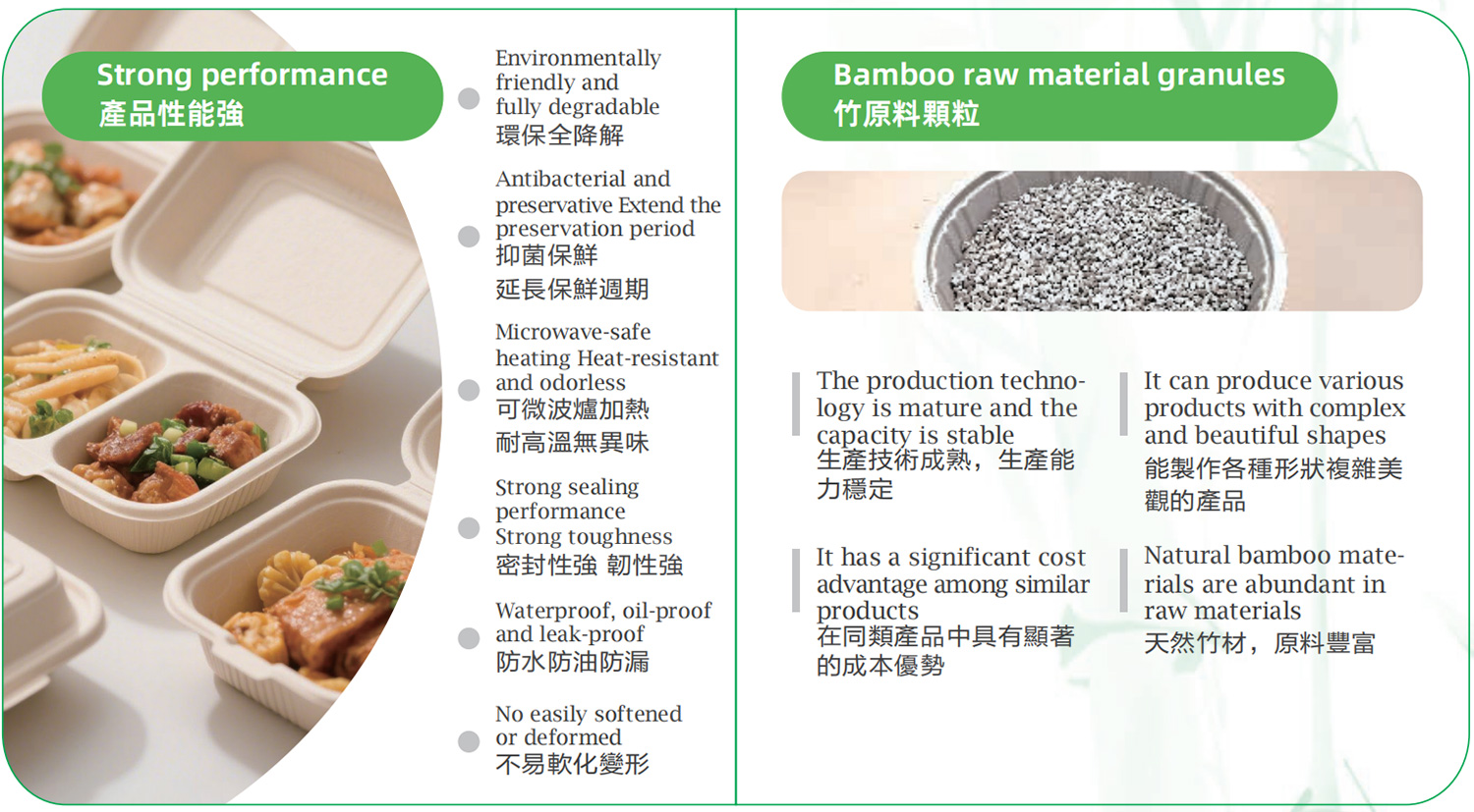 The company has broken through the technological barriers of bamboo bio based composite materials, developedand applied for multiple national invention patents. It has made bamboo fiber into fully degradable compositematerials and ingeniously cast them into tableware. From raw material collection to finished product production,every step is strictly controlled to ensure high quality and environmental standards.